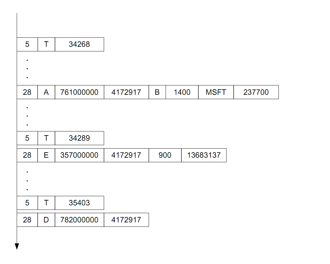 NASDAQ's TotalView-ITCH data feed contains so-called event message data, which allows for a very efficient transfer of information. Instead of streaming the state of the entire limit order book after each update, only the information on the limit order event that changes the order book is sent to market participants. Below you find the stylized structure of the message data. More information on NASDAQ's Historical TotalView-ITCH data can be found on NASDAQ's website. general structure.Considering the enormous number of messages generated by the market's activity every day, NASDAQ's TotalView-ITCH message system is designed to present information in a parsimonious way to reduce redundancies in the records. Each message begins with an indicator of the length of the message in bytes followed by a message type indicator and further event-specific information. Time stamps are recorded in two steps. Time messages indicate the seconds after midnight and each individual market event message, such as limit order submission, cancellation, etc., contains a time stamp indicating the time since the last full second in nanoseconds. example messages.The figure below illustrates the structure of the TotalView-ITCH messages from which LOBSTER reconstructs the limit order book. Please note that the original data is stored in binary files, depicted here is a 'readable' version. The messages of type 'T' are time messages giving the number of seconds after midnight. The first message in the graph below indicates that the following activities occur '34268' seconds after midnight, i.e. after 9:31:08.