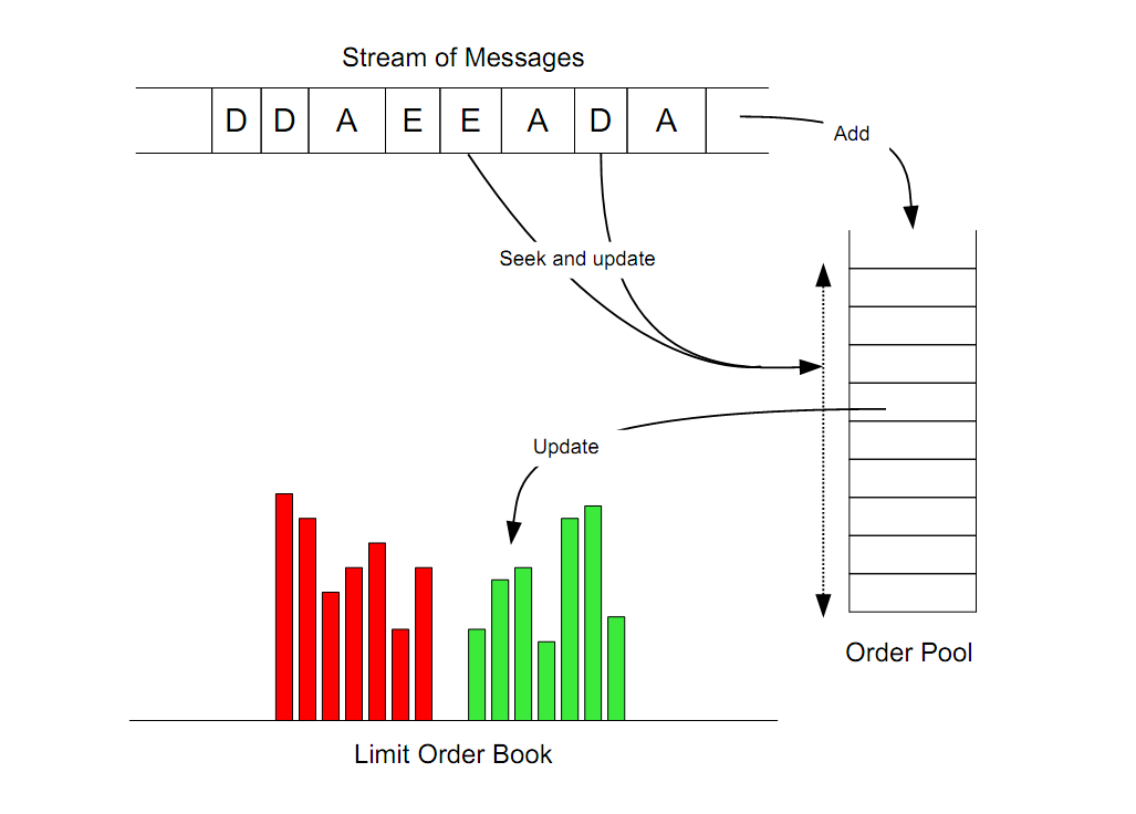 ![]() The second message is a limit order submission indicated by the type 'A' (for 'add'). The third element of this message gives the number of nanoseconds since the last full second as recorded in the first depicted message. The exact time stamp of this order submission is hence 9:31:08.761000000. The nanosecond time stamp is followed by a unique order ID, '4172917', which is used to reference the order in case of an execution or cancellation. The message of type 'E' together with the preceding time message indicate a partial execution of the order with ID '4172917' at 09:31:29.357000000. The transaction of '900' shares is uniquely identifiable by the transaction ID, '13683137'. Note that in the execution message, only the unique order ID, '4172917', is referenced. The details of the executions such as the price, the ticker and market side have to be inferred from the previous submission message. At '35403' seconds and '782000000' nanoseconds after midnight (or 09:50:03.782000000) the message of type 'D' indicates that the previously submitted and partially executed order with ID '4172917' is deleted and hence removed from the limit order book. Notice that the message is again kept as brief as possible to avoid any redundancies. reconstruction algorithm.outline.The figure below shows a stylized version of the limit order reconstruction process. Depicted at the top is the stream of messages from NASDAQ's Historical TotalView-ITCH files that have been introduced above. The letters indicate the different types of events: Submissions ('A'), executions ('E') and deletions ('D'). The limit order book, shown at the bottom, is updated with each incoming message by aggregating the available limit orders in the order pool at common price levels. Throughout the day the entire process is repeated in a loop. The three steps depicted in the figure are executed in a clockwise rotation from the first to the last available message to get the evolution of the limit order book.