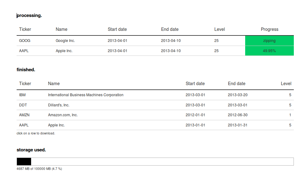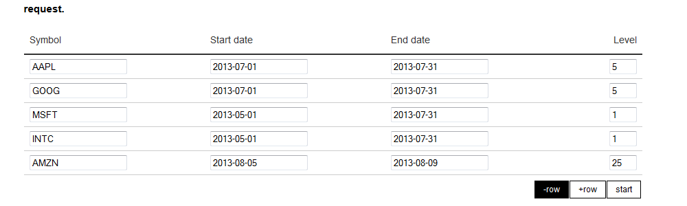 Requests are entered into an intuitive interface, which is depicted below. Entering the ticker, start and end date as well as the number of levels is all there is. Setting up a request takes less than 5 seconds.